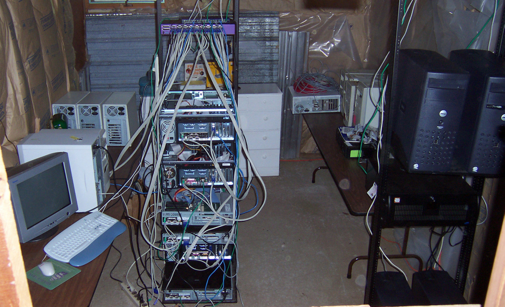 The hardware was purchased at auction or on sale, and it is server-class hardware: rackmount, heavy-duty case, some SMP, SCSI and a lot of memory. The same auctions yielded racks, switches and other hardware for pennies on the dollar.