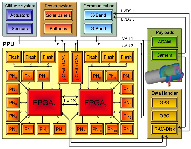The PPU is connected to the rest of the satellite by fairly slow quad-redundant controller area network (CAN) links and two fast (200Mb/s) low-voltage differential signalling (LVDS) links for image data from the on-board camera. Figure 2 shows an overview of the hardware architecture. Most interesting to mention is that the PPU also can take over satellite control from the OBC. In fact, this is one of the experiments that is supposed to validate that software and hardware COTS components can fulfill mission-crucial tasks.