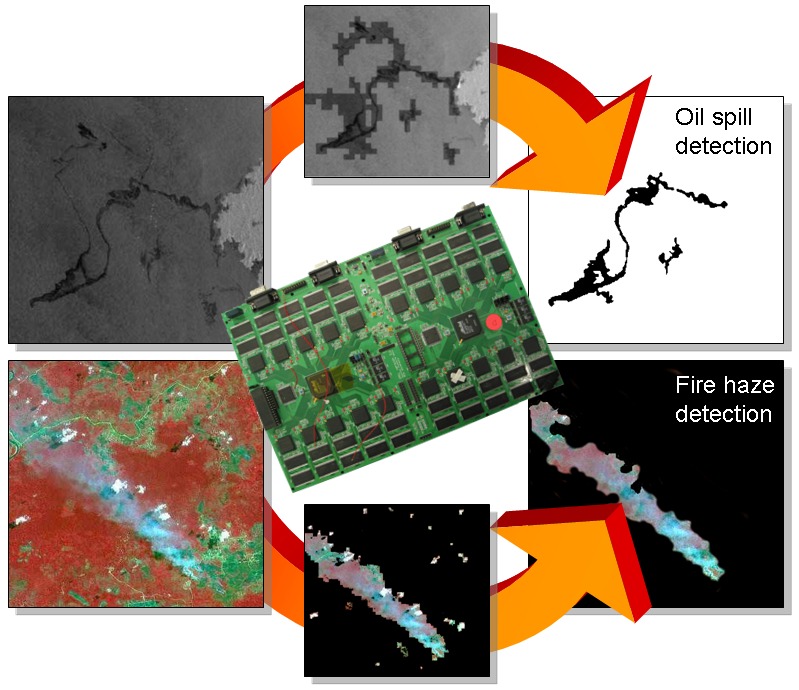 Currently, two specific applications are supported: the detection of oil spills and haze observation originating from man-made and natural fires. Both make use of the additional processing power available through the FPGAs to pre-process image data streamed into the individual processors. The images in Figure 3 are examples from a simulated acquisition campaign over a complete daylight period of one day's orbits. The raw data from a 10% duty cycle covers an area of approximately 3 million km2. If only 0.001% of this data showed oil spills, this would be equivalent to 62 catastrophic Prestige oil spills. With a fully functional PPU, the processing time for simultaneous execution of both disaster-detection tasks is 25% of the total daily orbit time. In contrast, however, it allows the evaluation of the entire data instead of only a small subset on the ground.