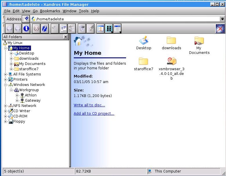a file manager similar to Windows explorer, which provides a desktop tool with drag-and-drop burning of music and data CDs, access to Windows and UNIX network shares