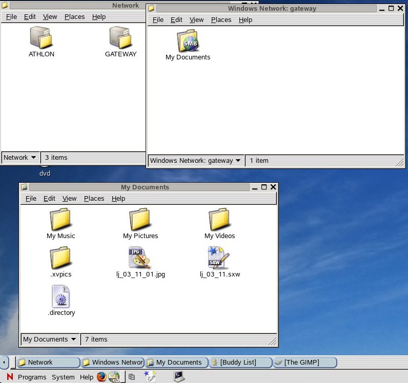In Figure 2, you can see a screenshot from a Novell Linux Desktop accessing the Xandros-shared directory. In the top left window of the NLD desktop, you can see two hosts in the Windows Network directory. The view represents two Linux desktop computers using the SMB or CIFS protocol. Neither machine has Microsoft Windows installed. In fact, the computer called Gateway runs Xandros Business Edition 2.5 on a Gateway 550 (Pentium III 550 MHz processor) with 384MB of PC 100 RAM and a 20 GB IDE hard drive.