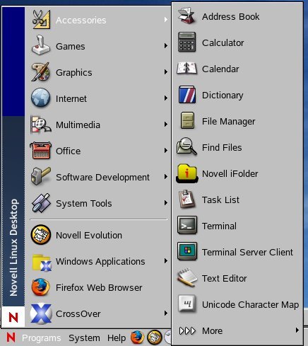 In Figure 1, you can get an idea of the functionality available on the Novell Linux desktop. In this figure we accessed the accessories menu. You can see the availability of many applications and tools, including the Microsoft Terminal Server Client and the Novell iFolder.