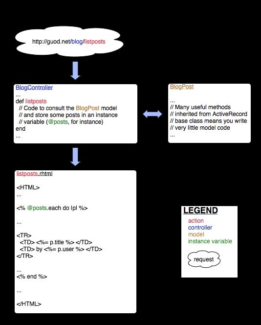 DF: It's probably easiest to start with the controller. Basically, Rails decides what object to send a method to based on the URL. So when a request such as