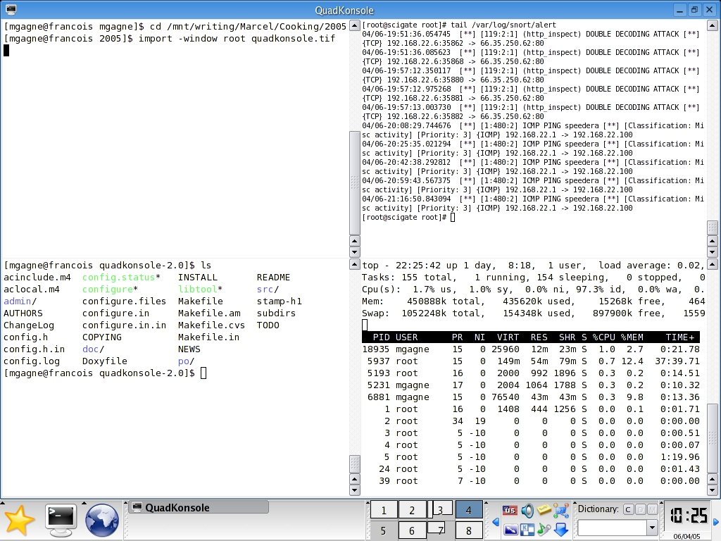 The final selection on tonight's menu is something so great, I'm frankly amazed I hadn't seen anything like it before. I decided it was great, because I started using it regularly as soon as I discovered it. Using KDE kparts, Simon Perreault created a program called Quadkonsole. As the name implies, it starts up four Konsole programs in a grid (Figure 5). There's no need to line up your Konsoles side by side or click from one shell tab to the next. To make things even nicer, the Quadkonsole creates only one task in the task bar, leaving your Kicker panel uncluttered. That feature is going to be particularly useful as I tell you more about this great terminal program.