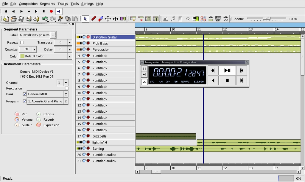 Figure 3 shows off a small but powerful MIDI sequencing system. The main program is Rob Buse's seq24, a lightweight looping sequencer designed in the style of the hardware sequencers of the 1980s and 90s. seq24 manages its connections internally, and the figure conceals the connections between the virtual keyboard and seq24 as well as the output targets for the individual sequences. Some of the sequences have been routed to the OPL3 synth; others have been sent to an instance of TiMidity running as a Soundfont server.