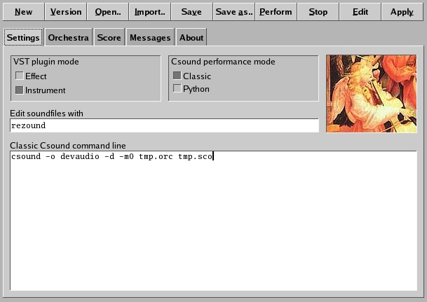 Csound developer Michael Gogins has given us CsoundVST as an integral graphic interface to Csound5 (Figure 1). CsoundVST combines all of the steps in the edit/compile/run cycle and adds a few neat amenities. User-configurable items include VST plugin mode, Csound performance mode and your choice of soundfile editor. Versioning is offered, a nice feature that creates a numbered series of output files. Basic start/stop performance controls also are provided. Figure 2 shows this new Csound GUI in action, running the code from the examples above.
