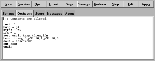 Classic Csound processes two files created by the user, an orc file, which is the Csound orchestra or the instruments; and the sco file, which is the score performed by the orc file instruments. The modern approach dispenses with this dual-file method and utilizes what is known as the CSD file, an XML-like file format that includes both the orc and sco file contents as well as the command-line options required to render the file to sound. Here's a trivial example in Csound's classic mode: