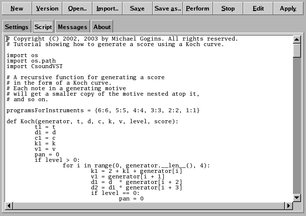 The code in Figure 3 is from Koch.py, a Python script by Michael Gogins and donated to the Csound5 examples directory. The script uses native Python code to create a Csound score generator. It then utilizes a series of imported Csound-related functions to define a Csound orchestra for processing the generated score. The last lines of the script invoke the Csound binary with appropriate options to run in real time. Click the Perform button in the GUI to render the script, the same as you would render a Csound orc/sco or CSD file.
