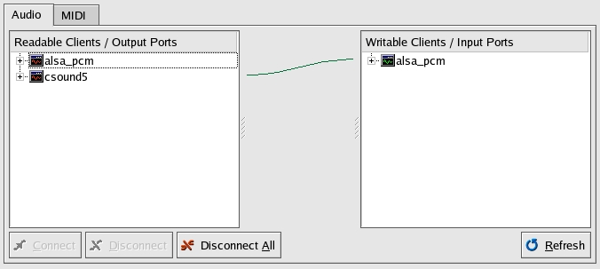These settings accommodate my SBLive. The -b software buffer value should equal JACK's buffer size; it must be less than -B, the hardware buffer value, and both buffer flags must be powers of two. Additionally, the JACK sample rate must equal the sample rate of your orchestra. Figure 4 shows how Csound appears as a client in the QJackCtl audio connection tab as a result of these settings.