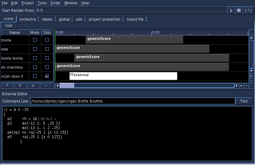 Although it is not a part of any official Csound package, I must make special mention of developer Steven Yi's blue, a powerful graphic environment for producing music with Csound. blue is a Java-based application that accommodates any version of Csound and includes a number of graphic tools for the creation of Csound scores and instruments. Alas, I don't have space in this article to describe adequately blue's extensive capabilities, but Figure 5 should give you some idea of blue's resources.