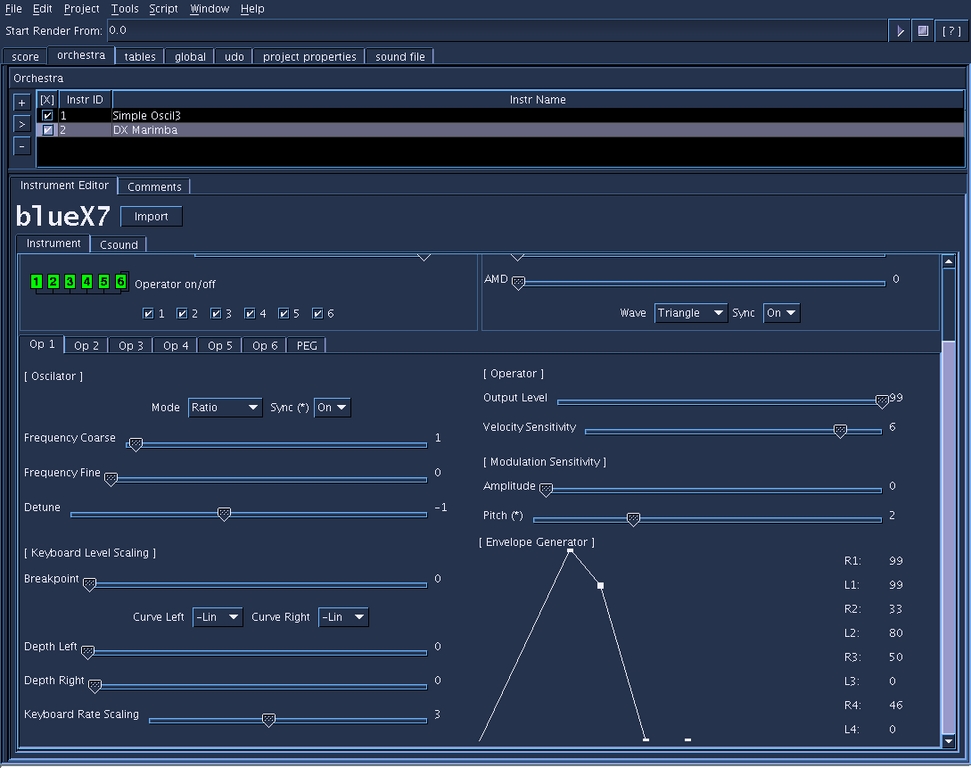 blue provides the Csound composer with some truly unique resources, such as its graphic scoring tools and the blueDX7 GUI for editing DX7 raw sysex patches for use within Csound (Figure 6). The blueShare facility gives the user access to an on-line database of user-defined opcodes. Interfaces are provided for the Jython and Rhino languages, dialect forms of Python and JavaScript, respectively. Also, a graphic instrument builder similar to blueDX7 is available for designing Csound instruments with real-time parameter control panels. If you're looking for the most complete Csound helper application available for Linux then you're looking for blue.