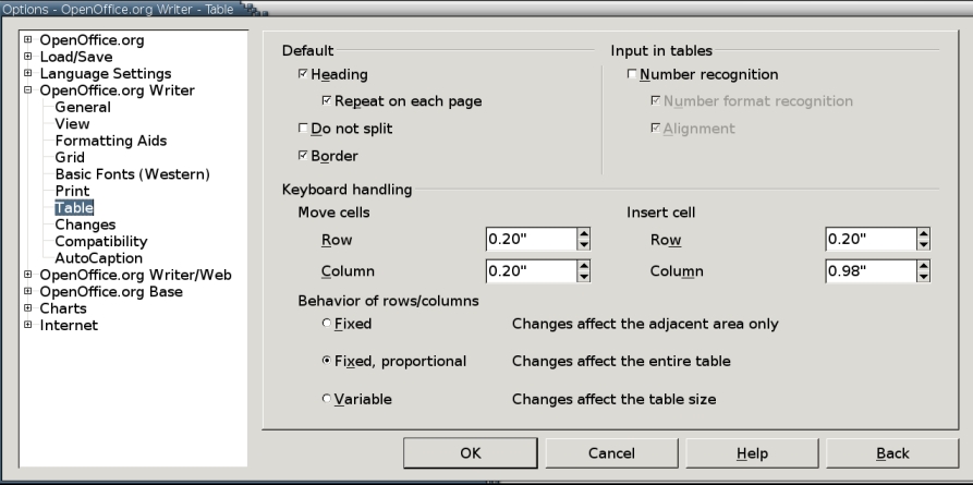 If you plan to use tables often, your first stop should be Tools -> Options -> OpenOffice.org Writer -> Tables. From this window, you can set the default behavior for tables in Writer. Most people safely can ignore the Keyboard handling section, which sets the size of cells when they are moved or added. However, you may want to pay attention to other parts of the window, even though the defaults settings are reasonable for most needs.