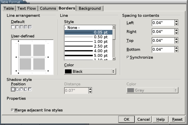 Borders: Sets the borders around cells. Which sides get border, the thickness, type and color of the line and any shadow all can be set. However, the most important feature is the Spacing to contents feature, which determines the distance between the borders and the cell contents. You also might choose to use no border at all, in which case you may want to select the Table Boundaries feature from the Table or the right-click menu so that you can see the borders as you work. The interface is one you soon will become familiar with if you use OOo regularly. It also appears on the tabs for headers and footers in page styles and is used for drawing objects.