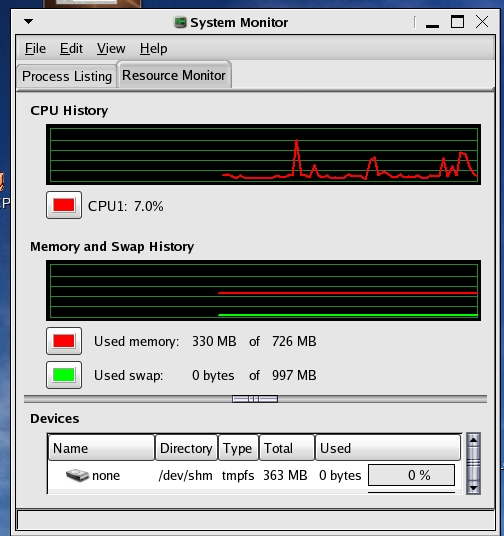 If you have enough RAM available, Linux uses that instead of the hard drive. In Figure 1, you can see a screenshot of Fedora's performance monitor on a system containing 768MB of RAM. Notice in a couple of places how the CPU jumped up while the memory remained steady. The monitored system is an AMD Sempron 2200 with a 1.5GHz processor. This system came from the Micro Center with 256MB of RAM and sells for approximately $250. It's a PowerSpec SBB1. I added 512MB of memory for $70.