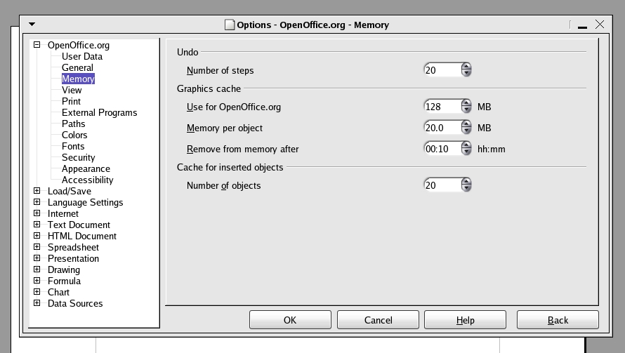 In the above figure, you can see that we selected the first expansion box and then clicked Memory with our mouse. This exposed the window you see in Figure 3. I changed the default values under the Graphics cache for Use for OpenOffice.org and Memory per Object. I increased the first value from 6 to 128MB. I also increased the second value from .5 to 20MB.