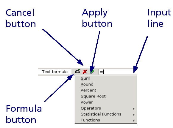 The Formula button, which opens a drop-down list of basic formulas, such as Sum, Percent and Square Root. Several categories of formulas also are available. In all, some two dozen formulas are available. They include most of the functions that basic users are likely to want. In addition, you also can enter manually +, -, * (for multiplication) and / (for division).
