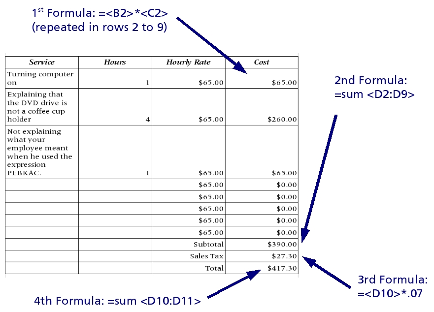 This is a second-generation formula composed of the results of all the other formulas in column D. If any hour or hourly rate in the table changes, the subtotal is updated automatically.