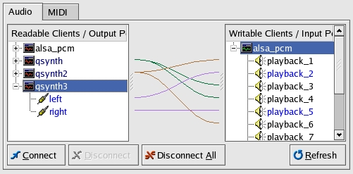 At this point, return to QJackCtl and start the JACK server if it isn't already running. Click on the Connections button and select the Audio tab to make your JACK audio connections. Figure 11 illustrates one arrangement of multiple QSynth engines with independent output ports connected to the ALSA PCM input ports; it's a good example of how QJackCtl simplifies complex routing arrangements.