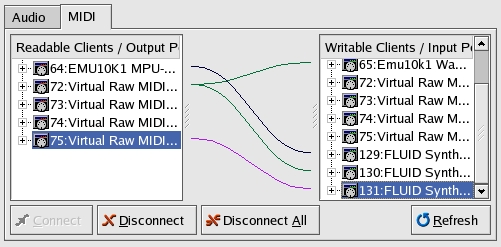 Now select the MIDI tab to set your MIDI connections. Here we find the same flexibility found in the audio tab, as shown in Figure 12. In that screenshot the input from my physical MIDI port--SBLive with adapter connected to a Casio CZ101 MIDI keyboard--is routed to the first QSynth engine. The first ALSA virtual MIDI port is connected to the second QSynth engine and to the EMU10k1 synthesizer on the SBLive. Finally, the last virtual MIDI output port is connected to the third QSynth engine and to the EMU10k1 synth. Again, a complex configuration is simplified by using QJackCtl.