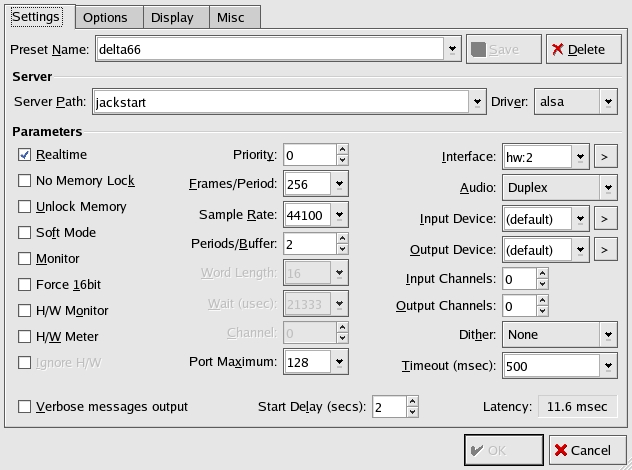 Assuming you have a working system, you now can click on the Start button to start using JACK. Figure 3 demonstrates QJackCtl at work with my M-Audio Delta 66. JACK typically handles only one soundcard at a time, so I have separate server configurations for my SBLive and Delta 66 cards. Figure 3 also shows the system status represented by the status panel and its visual display.