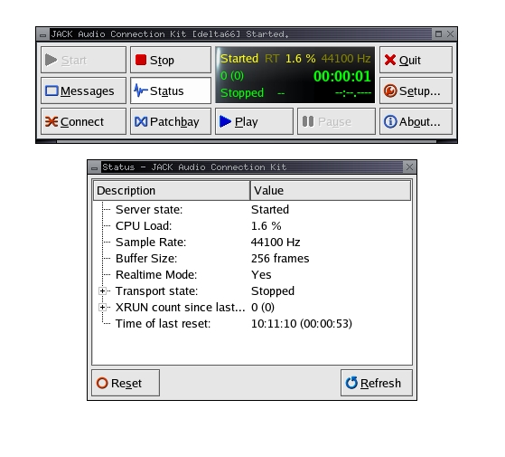 Figure 1 shows off QJackCtl's main panel. Its buttons control the JACK system active state (start/stop/quit), messaging and status reports, device connection management, transport control (play/pause), the setup configuration and a program information pop-up. The main panel also includes a visual display of the information reported by the status button.