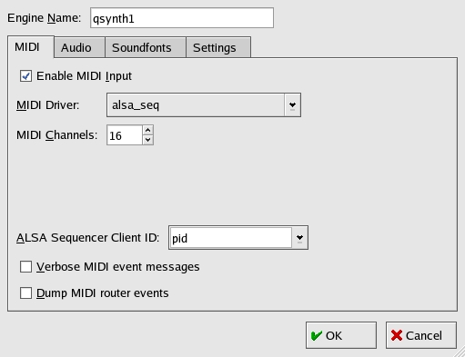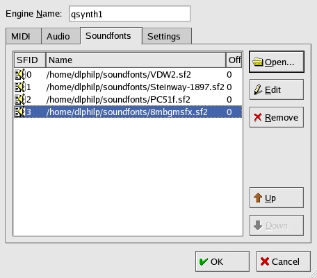 Click the Soundfonts tab to specify the soundfont banks you want to assign to the QSynth engine. As Figure 7 shows, you can list multiple banks, but only the last font listed is active.