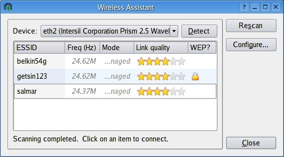 One of the best such tools I've found is Pawel Nawrocki's Wireless Assistant. This is a great-looking little program that lets you scan for available wireless networks and then connect to them with a single click. Each identified network is identified by factors such as link quality and encryption. The application can be configured to handle WEP keys automatically, ignore various types of networks (ad hoc or encrypted), automatically run a script upon connection and more. Figure 1 shows the application in action.