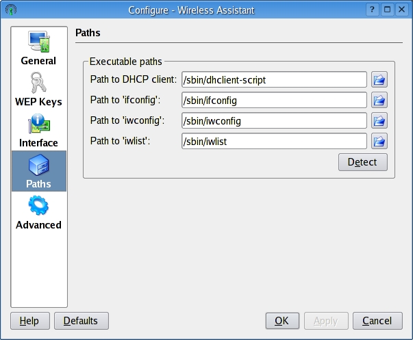 The actual program name is wlassistant. When the package first starts, it automatically checks for your active network device. If it doesn't, click the Detect button. If you still are having problems, it is possible that the path to the wireless tools hasn't been set properly. Click the Configure button and a configuration dialog appears. In the left-hand sidebar, categories of options are listed while the actual changes take place in the larger right-hand window. Click the Paths button to confirm the pathnames to the wireless tools commands (Figure 2). You can either enter them manually or click the Detect button.