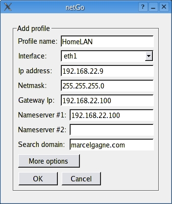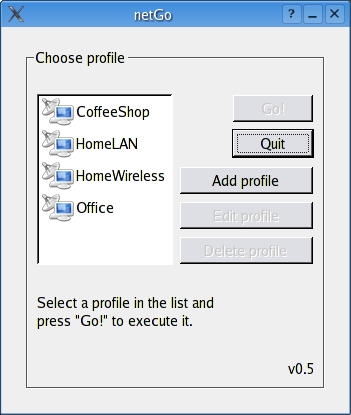 To get your copy, head to the netGo Web site (see Resources). If you choose to build from source, this is your basic extract-and-build five-step, so nothing too scary here. To run the application, run the command netgo. You are asked to provide the root password at this point so that you can make network address changes later.