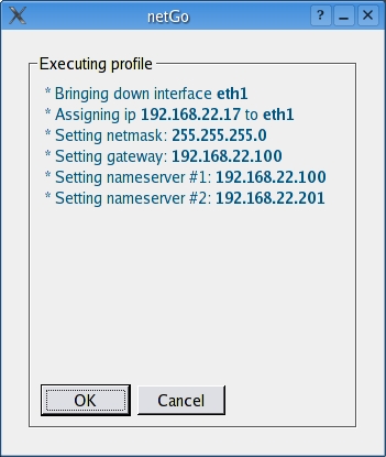 Continue adding as many profiles as you need in the same manner. To activate a profile and apply your network settings, click on the profile name and then click the button labeled Go! to apply the changes. A status window then appears displaying the new settings (Figure 6).