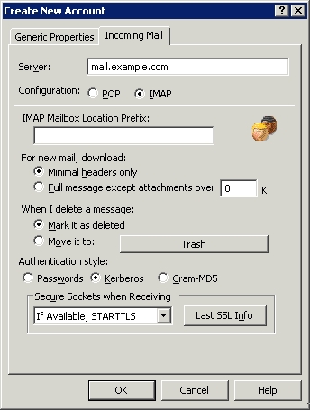 Start the account creation process, and choose Skip directly to advanced account setup. Enter the required information for the SMTP and IMAP settings. Make sure to choose If Available, STARTTLS for the Secure Sockets settings, and under the Incoming Mail tab, make sure to select Kerberos as the authentication style (Figure 4).