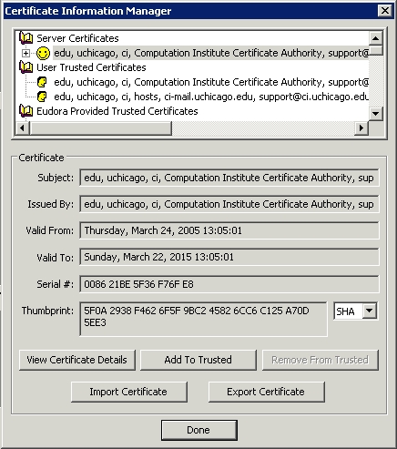 Once you've gotten your account configured, you may get an error the first time you try to connect saying that either the connection has broken or GSSAPI failed. These errors aren't very descriptive of the actual problem, which is that Eudora doesn't trust your self-signed SSL certificates. To fix this, edit the properties for your newly created personality (Figure 5). Click on the Incoming Mail tab, then the Last SSL Info button, and then the Certificate Information Manager button (Figure 6). If you click the Add To Trusted button, your self-signed certificate will be trusted by Eudora as valid. You need to do this for your SMTP server as well the first time you try to send mail.