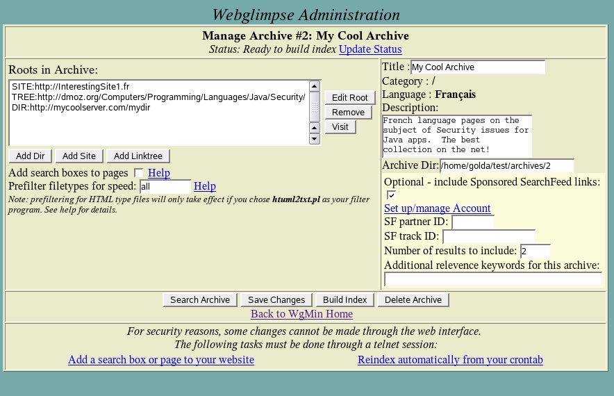 So, now you have a searchable archive of your chosen sites, the coolest collection of links anywhere on your particular subject. Users everywhere can take advantage of your research and use your server to search through your highly optimized index. If you want, you now can serve ads in order to generate revenue and support your site. Back on the Manage Archive screen shown in Figure 2, check the box labeled Optional - include Sponsored SearchFeed links. Then, click on Set up/manage Account, which is a link to set up an account with Searchfeed.com. An on-line advertising and content provider company, Searchfeed.com provides sponsored search results that are supposed to be relevant to the keywords on which the user searches. Once your account is set up, simply enter the partner ID and track ID provided by Searchfeed.com and choose how many ads should appear at the top of your search results. It's pretty simple to set up. To get the most out of your ads, you can use the suite of on-line tools provided by Searchfeed.com to monitor what keywords users are searching on, which ads they are clicking on and how much you make from each click.