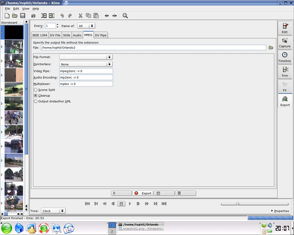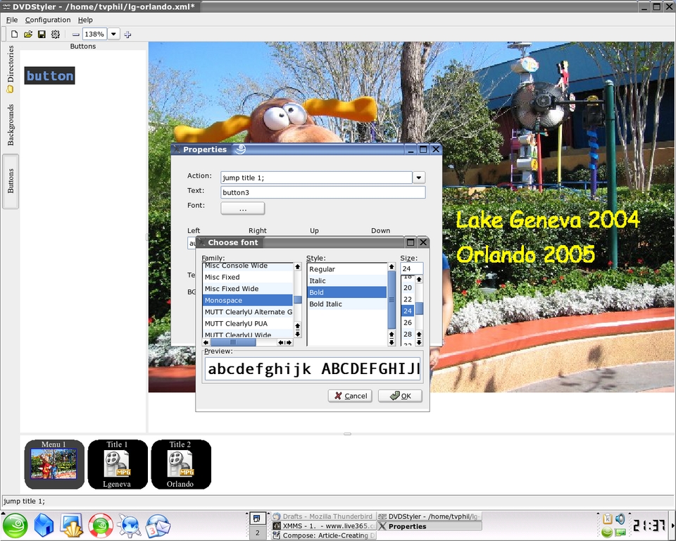 First, you need a few dependencies in place before you install DVDStyler: wxGTK, DVDAuthor, MJPEG Tools, MPEG Toolbox (mpgtx), Xine or Kaffeine (optional, for previewing video) and Totem (optional, for generation of thumbnails). Any of these can be found at your favorite RPM or Debian package resource, like those provided in the on-line Resources for this article. DVDStyler creates only video DVDs. It does not create video on CD, better known as VCD and SVCD. If you don't have a DVD burner, you're unfortunately out of luck as far as using DVDStyler. Now, let's get to the business of creating a DVD video after editing a video in Kino.