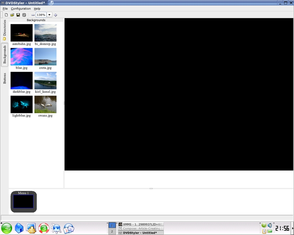 Click on the top-left corner, under the word File on the white square icon to start a new project. If you were returning to a project you already started, you would click the yellow folder icon next to it to find your saved project. Next, on the left side, click on the Directories tab, and you should see all the media files in the current folder that are compatible for DVD creation in DVDStyler. Simply click and drag any of those files you want to use in your DVD to the bottom of the screen to the right of the Menu 1 thumbnail, in the sequence you want, from left to right. This area is commonly referred to as the time line. Now you are ready to create a background for your menu.