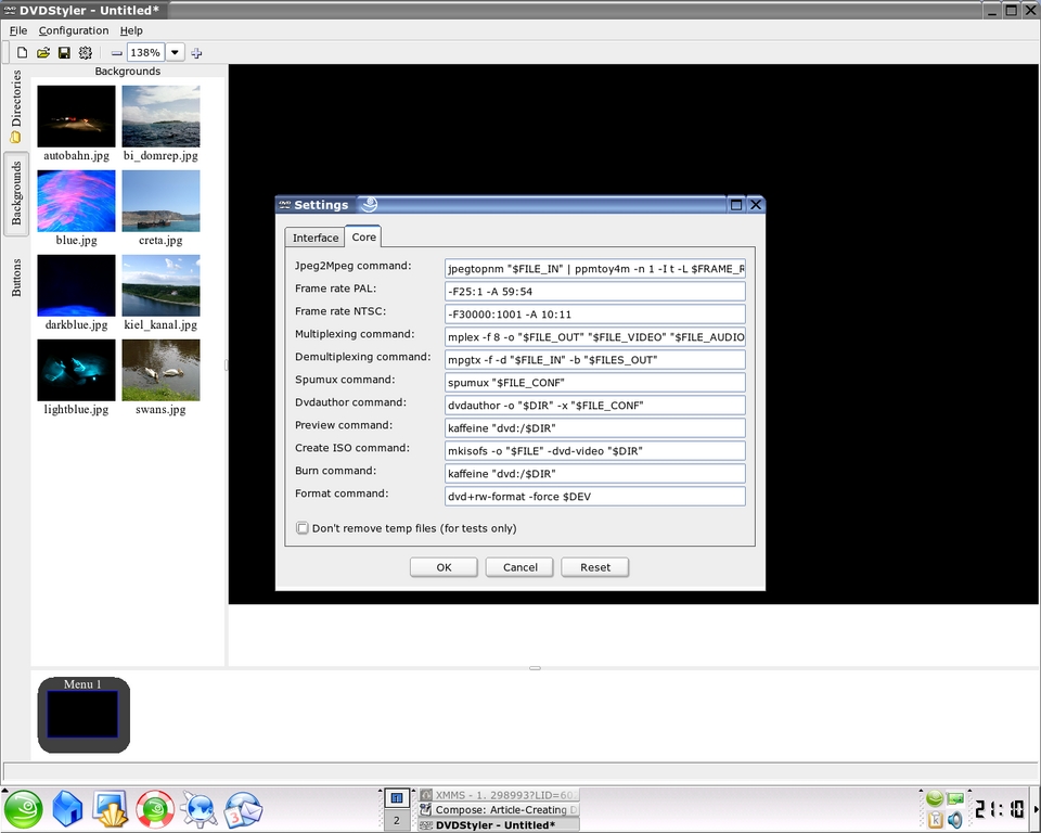 Next, click on the Core tab to see all the commands and dependencies that are used. The preview and burn commands use Xine by default for previewing, but if you're like me and use Kaffeine, simply type in Kaffeine where it says Xine, so you can preview before burning. Now you are ready to begin inserting your files for menu creation.