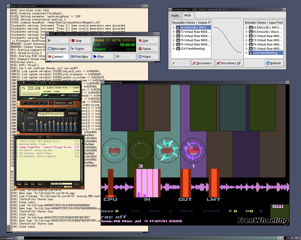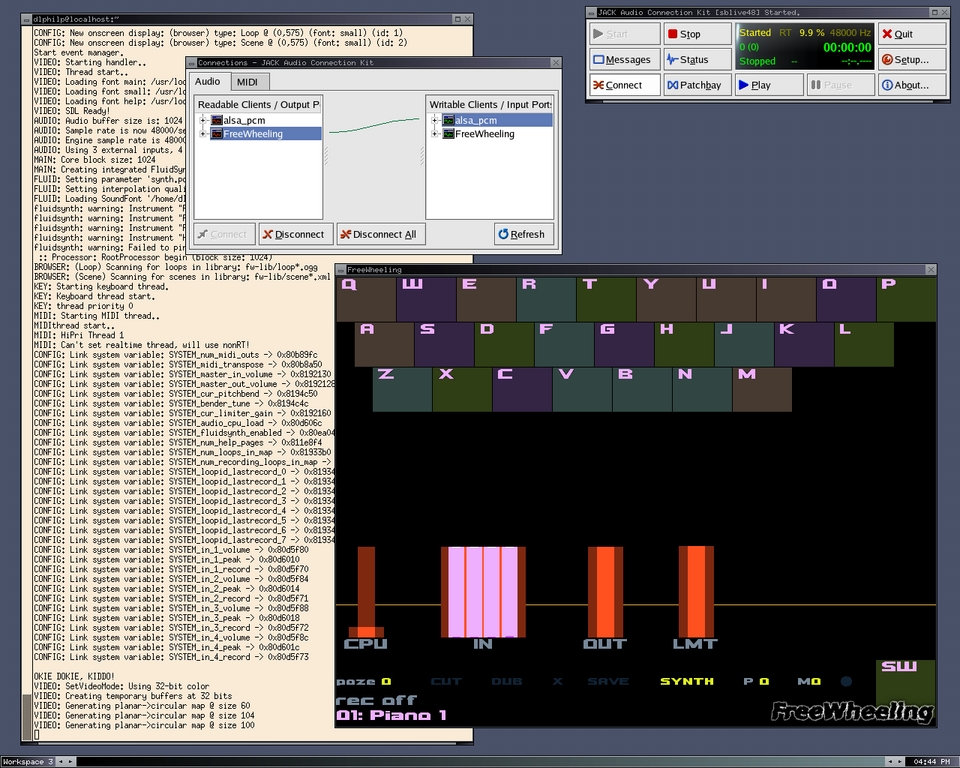 FreeWheeling is a JACK-aware application, so you need to start the JACK audio server before opening FreeWheeling. After starting JACK, open an xterm, type fweelin at the prompt, and gaze in awe as your screen fills with messages as FreeWheeling starts up. Figure 1 shows part of that message stream, along with my JACK audio connections and the FreeWheeling default display. FreeWheeling does not autoconnect to any other JACK client, so you need to make your connections with jack_connect or a GUI such as Rui Capela's QJackCtl. Of course, thanks to JACK, you can route FreeWheeling's audio I/O to and from any other JACK client, for example, attaching the audio output from an external softsynth to FreeWheeling's audio inputs. FreeWheeling is also an ALSA sequencer client, which means it can send and receive MIDI messages to and from any other ALSA sequencer client, such as that external softsynth.