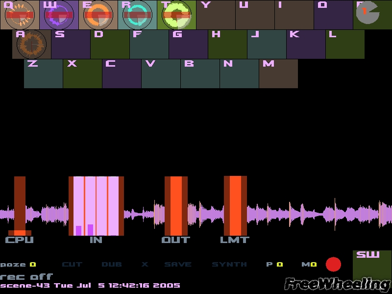 Basic operation of FreeWheeling is easy. Audio input can come from a record-enabled mixer channel, an OGG-encoded soundfile or the internal synthesizer. The main display shows the input sound as it passes through FreeWheeling (Figure 2). By default, four input channels are defined with separate volume control by pressing the up or down arrow key and the input channel number (1,2,3,4). Press a QWERTY key to record a segment and then press it again to play the recording as a loop. Repeat this basic procedure with other keys, using any previous loop as real-time accompaniment. The u key deletes the last recorded loop, Space+[key] deletes the loop at [key] and Alt-Space deletes all current loops. F8 saves the last recorded loop as an OGG file, while F7 saves an entire collection of loops as a scene. Synth patches, audio loops and scenes all are selectable from FreeWheeling's browser. The b key rotates the browser through its loadable types, the keypad + and - keys scroll the available items for each type and the Enter key selects and loads an item.