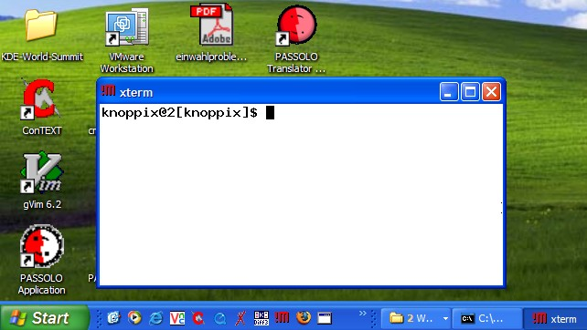 Figure 1. A remote xterm, actually running elsewhere on a Knoppix box, is visible on a Windows XP Professional workstation. The connection is made using NX.