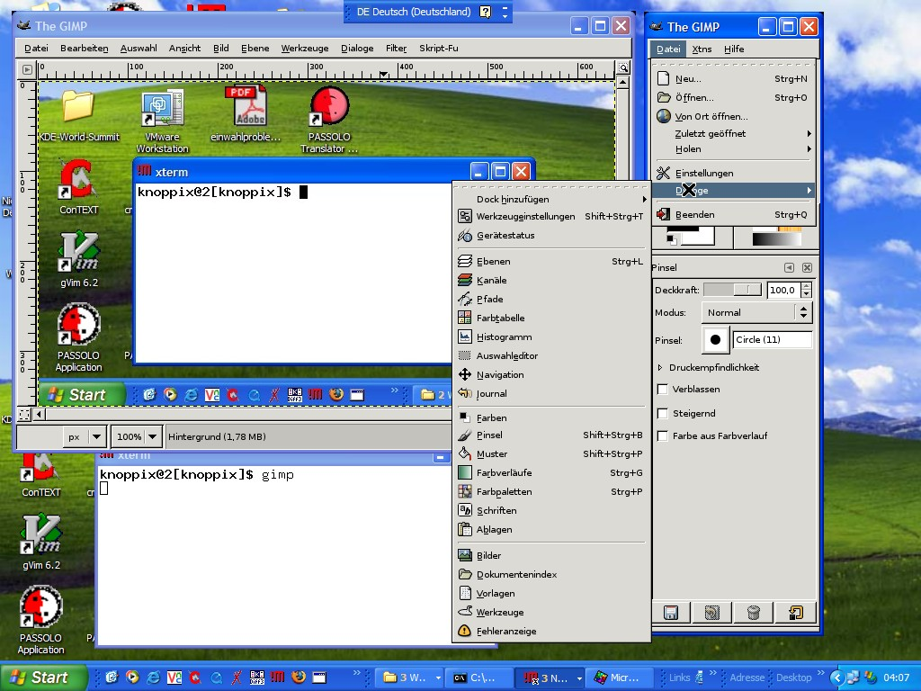 Figure 2. The remote xterm has been used here to launch a remote instance of The GIMP. This is one way Windows users easily and inexpensively can access applications running on other platforms, such as GNU/Linux. In this case, Windows Server CALs as well as Photoshop licenses are rendered redundant.