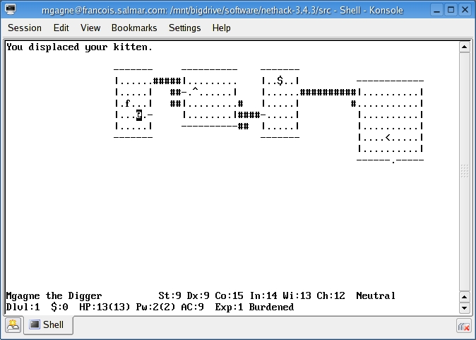 I highly recommend that you check out the text version of the game at the NetHack Web site (see the on-line Resources), but make sure you visit Warren Cheung's SLASH'EM Web site, home of the “Super Lotsa Added Stuff Hack, Extended Magic” edition of NetHack. SLASH'EM is NetHack kept up to date with new levels, new monsters, spells and so on. Getting and building SLASH'EM is also easier than navigating through the various cryptic instructions for building the official NetHack. SLASH'EM provides a simple configure script making this an easy extract-and-build five-step: