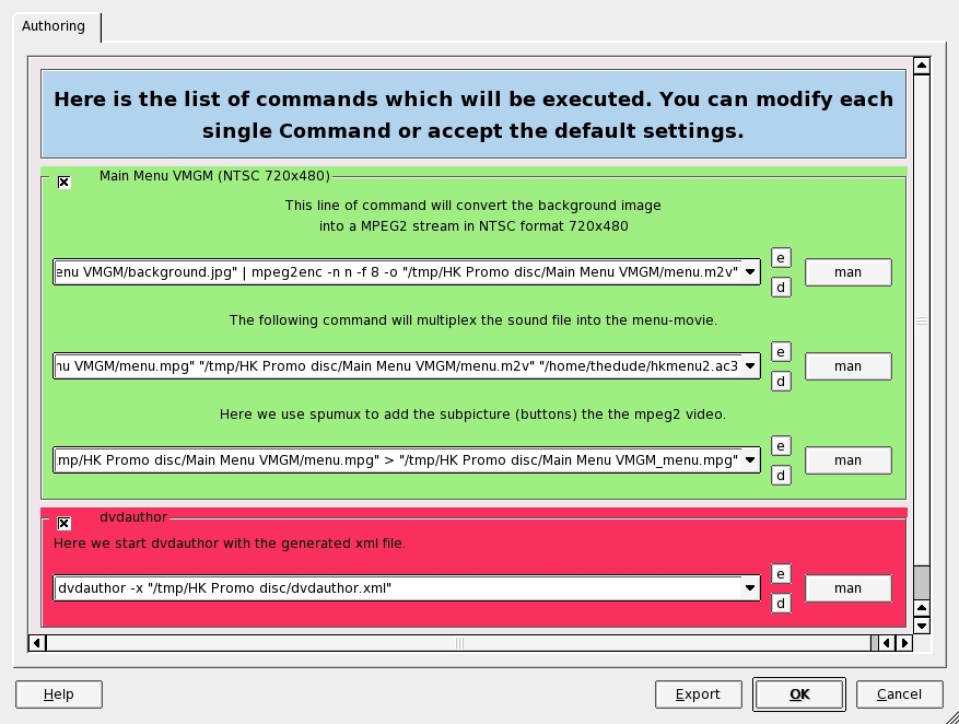 Watch carefully for any error flags printed in red. If you ignore them, you'll find yourself burning coasters, if you have a burnable image at all. If you do get any red flags, re-run the batch, clicking the Export rather than the OK button, which will export a shell script that you can disassemble and tweak to track down and correct your problem. This isn't often necessary, but every once in a while the program just doesn't generate the proper output and it has to be hand-tweaked.