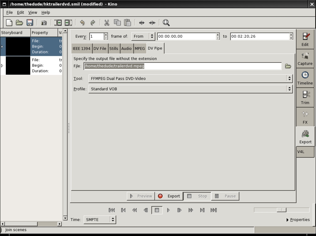 If you're working from footage taken on a miniDV camera, outputting a DVD-ready video from Kino is relatively simple. If you haven't used it before, Kino's interface is comfortable and easy to navigate. Good user guides are available at several places on the Web, most obviously at Kino's home page (kinodv.org/article/archive/13). It's not a multitrack editor, more's the pity, but for quick-and-dirty edit work with basic transitions and soundtrack mixing, it works encouragingly well. When outputting video from Kino, I've found that I get the best results (for both video quality and a minimum of sound sync slippage) with the dual-pass encoding in the DV Pipe screen.