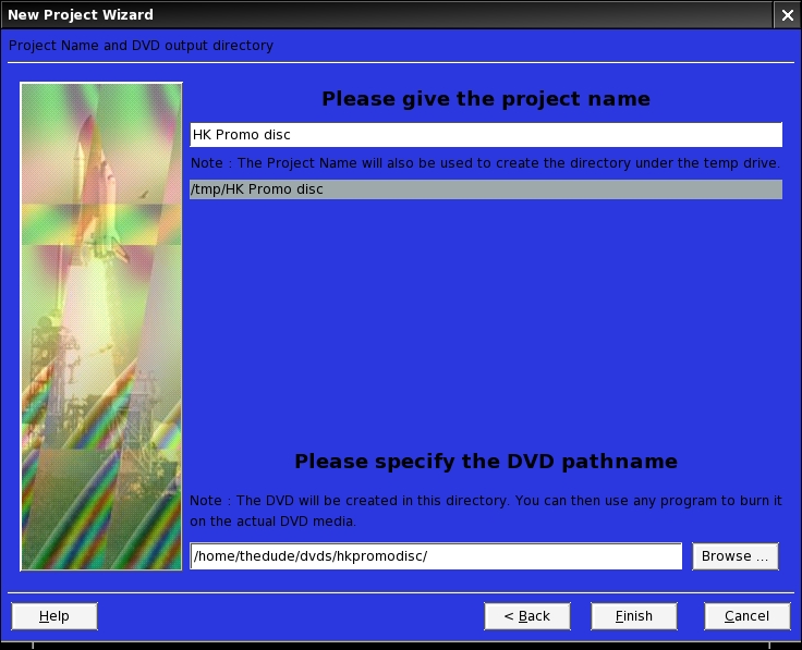 Only two screens long, the wizard is quickly finished and we're ready to start building the DVD itself. For the purposes of this tutorial, I'm assuming you already have DVD-spec MPEG-2 video to work with. If you don't, see the sidebar for a quick run-through on encoding DVD video. I'm going to be building a DVD with the trailer and blooper reel from my independent film, Hunting Kestral, which was edited in Kino with titling done in Blender.