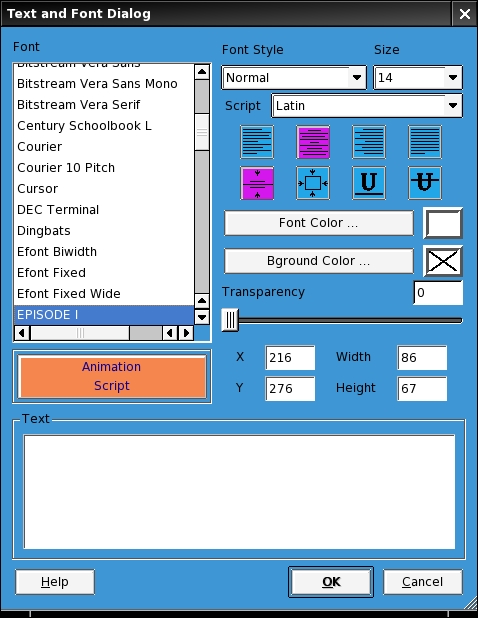 After drawing the box, the text creation dialog appears, and you can select from any of the fonts installed in your X11/fonts directory, as well as set the color, alignment, size, style and background color for your text box. Specialized TrueType fonts should be dropped into this directory before starting QDVDAuthor, and they will appear in the font selection dialog. This is also the place where you adjust the dimensions of your box and its placement (although placement can also be adjusted by simple drag and drop in the main window).