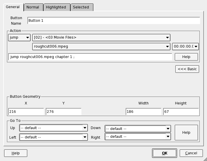 Here, you assign the action that the button will take (jump to a file, call a menu or resume). If you click the Advanced>>> button, you can further define the way the navigation controls move the cursor around the DVD menu (the up, down, left and right list boxes), routing each directional button to a different button on the screen. So, for example, in my current project, I have five buttons, and I want the viewer to be able to navigate between each button in a fairly obvious fashion (Figures 9 and 10).