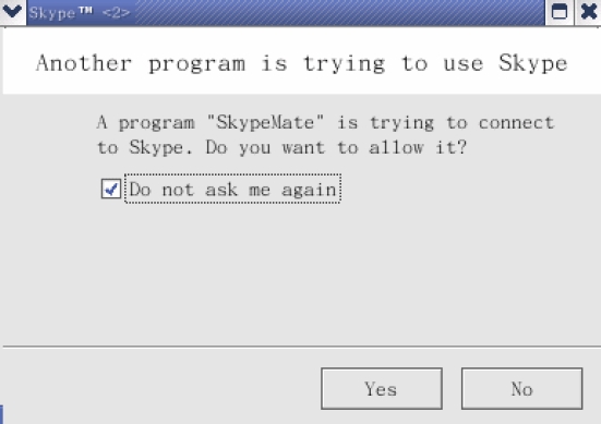 Double-click the SkypeMate icon on your desktop (which points to /usr/bin/SkypeMate). Skype will pop up a window asking you to give SkypeMate permission to use its API to control Skype (Figure 3). Check the box Do not ask me again, and then click Yes (that way, you won't be asked to give permission again).