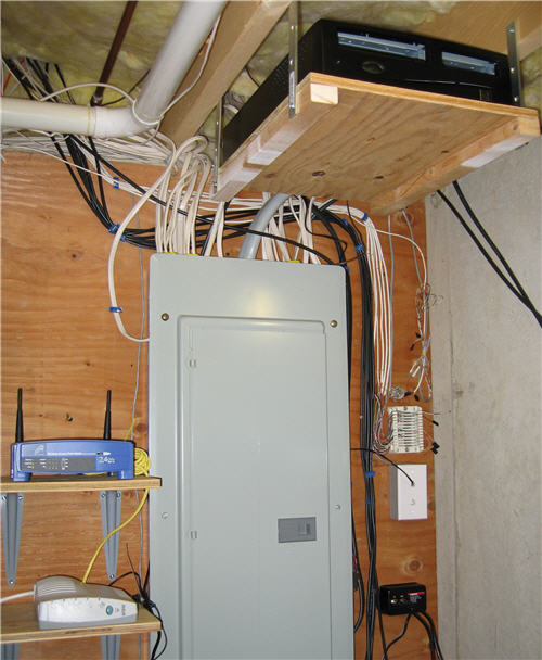 Figure 4. Skype server to provide 24/7 phone service. Server is at the top of the photo, cable modem and wireless router are to the left, and the patch board for household phone wires is to the right. In the center of the picture is the power distribution cabinet for my house.