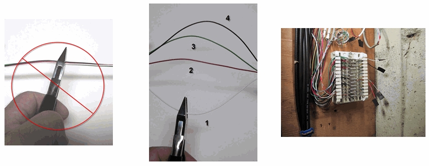 Figure 6. Steps for cutting your phone lines: step 1) don't cut all the wires at once; step 2) cut wires one by one; step 3) insulate ends of cut wires as you go.