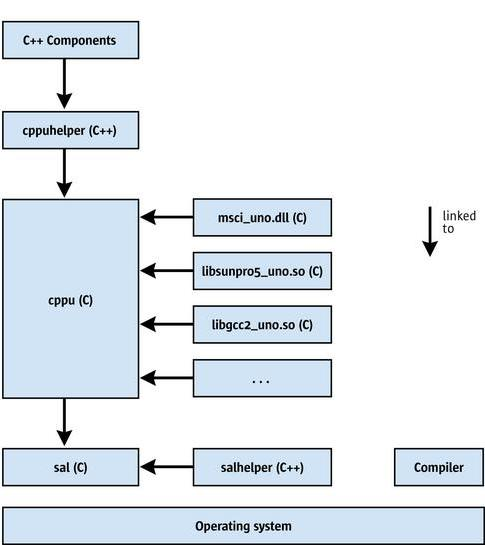 We have to link the following dynamic libraries: libstlport_gcc.so, usually written in /usr/lib during the installation process of stlport; libsal.so, libsalhelpergcc3.so, libcppu.so and libcppuhelpergcc3.so, all stored in <OpenOffice directory>/program. What are these libraries for? We could say that libsal.so is the base of the whole UNO system (see Figure 1); sal is short for system abstraction layer. This library contains some useful runtime functions, but it does not refer to any UNO component. libsalhelpergcc3.so helps libsal.so. libcppu.so (C++ UNO) is the core of the C++ system of libraries. Its functions create interfaces, manage bridges and so on. Finally, libcppuhelpergcc3.so manages the bootstrap of UNO.